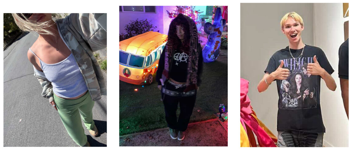 Last but not least is Aiden, with a smile as effortless as his streetwear. Aiden is wearing a great streetwear couture, starting with a black T-shirt covered in characters from the movie Twilight from Goodwill, which adds a nice piece of individuality and quirkiness. With a silver chain with a cross from a pawn shop, baggy black denim with cool distressing and almost patchwork accents handmade by his friend, and classic black boots from Reebok. Aiden acknowledges Santa Cruz’s local style focuses on authenticity and self-expression over conforming to worldwide fashion standards, which you may see in other countries and cities. Aiden gets his inspiration from the people closest to him, rather than from famous people he doesn’t even know. He knows anyone can dress confidently on a budget by finding pieces that spark joy. Aiden definitely chooses to wear earth tones the majority of the time, but makes sure to add some pastels in his wardrobe during the spring.