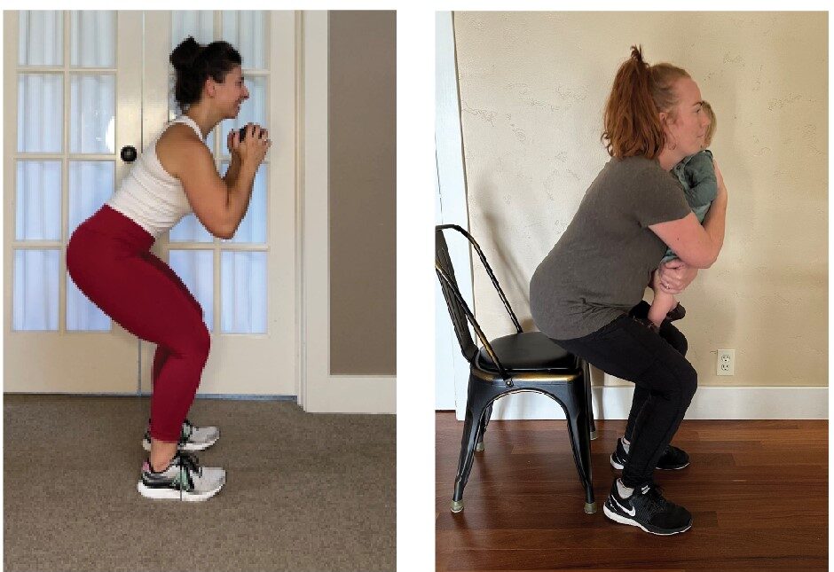 Mothers get up and down many times a day and doing so with a baby is much more challenging. Young children can weigh 35 pounds. So one of several prescribed exercises is the weighted chair getup which helps mothers perform getting up and down many times a day with their little one with greater ease. (See picture) This and many others should be integrated both prenatally and postpartum as long as there are no medical contraindications or pain. This is why walking more or trying yoga are not adequate if you are asking your body to work in very specific ways.